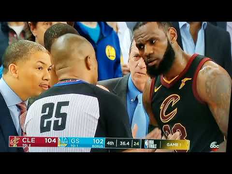 Kevin Durant goes into the lane, LeBron James gets hit, falls down, offensive foul (after a LOT of deliberation!!!) on Durant -- probably aiding in sealing the game for the Cavs, massive underdogs in this series.